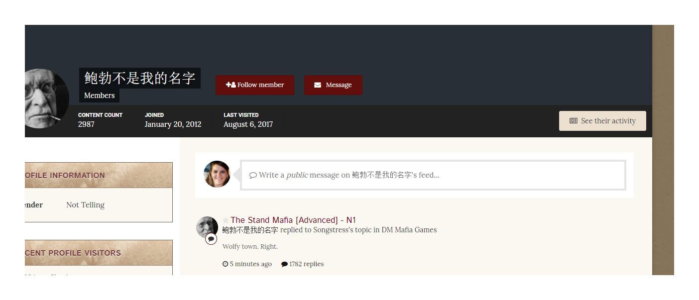 But honestly Cory's thoughts on Not Bob are spot on from what I saw in my catch up. I noticed yesterday in my little bit of catch up I did, the majority of his posts are "wolfy" "town" while quoting a post and with no thoughts attached... and sometimes it's hard to tell if he's serious or not. I just don't know. I don't like it.