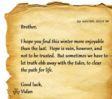 This made Anamira feel very uncomfortable, so she changed the subject. “Is that the letter Vidan gave you?” She nodded at the paper in his hand.