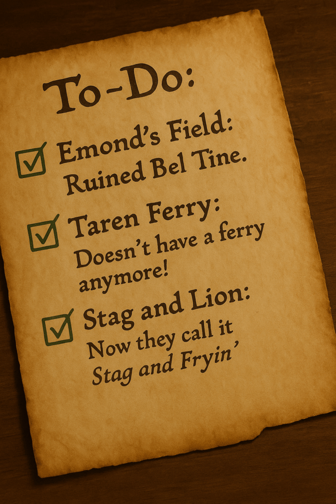 That was a fun moment in The Great Hunt. And it was right next to another moment that is funny if you take a step back and notice the absurdity of the situation: Rand and company are chasing after the Horn of Valere, as Fain recently stole it back in Cairhien. They have reason to believe he's gone to Toman Head, and time is of the essence, so they decide to head to Stedding Tsofu to use the Ways to follow him there. And I guess it's -- I don't know -- polite or something to ask the elders for permission to use their Waygate, so they seek an audience. Remember, time is of the essence. Whoever blows the Horn first will be linked to it for as long as they live, so it's really important to get it back before Fain figures out how to open the box. But the elders insist on trotting this drooling husk of an Ogier out from a back room, and showing Rand's group what happened to the last of them to have gone into the Ways. Fain could be halfway to Toman Head tooting out a rendition of Yankee Doodle Dandy, but here we are receiving a PSA. This is your brain. This is your brain after the Ways. Are you sure you want to go? Gosh, I don't know, are you sure you want the good guys to win in the Last Battle? We've been in the Ways before, so we'll just be on our way. If you guys really want to protect people from the Ways, I hear there’s a Waygate up by Fal Dara that needs a new door! -